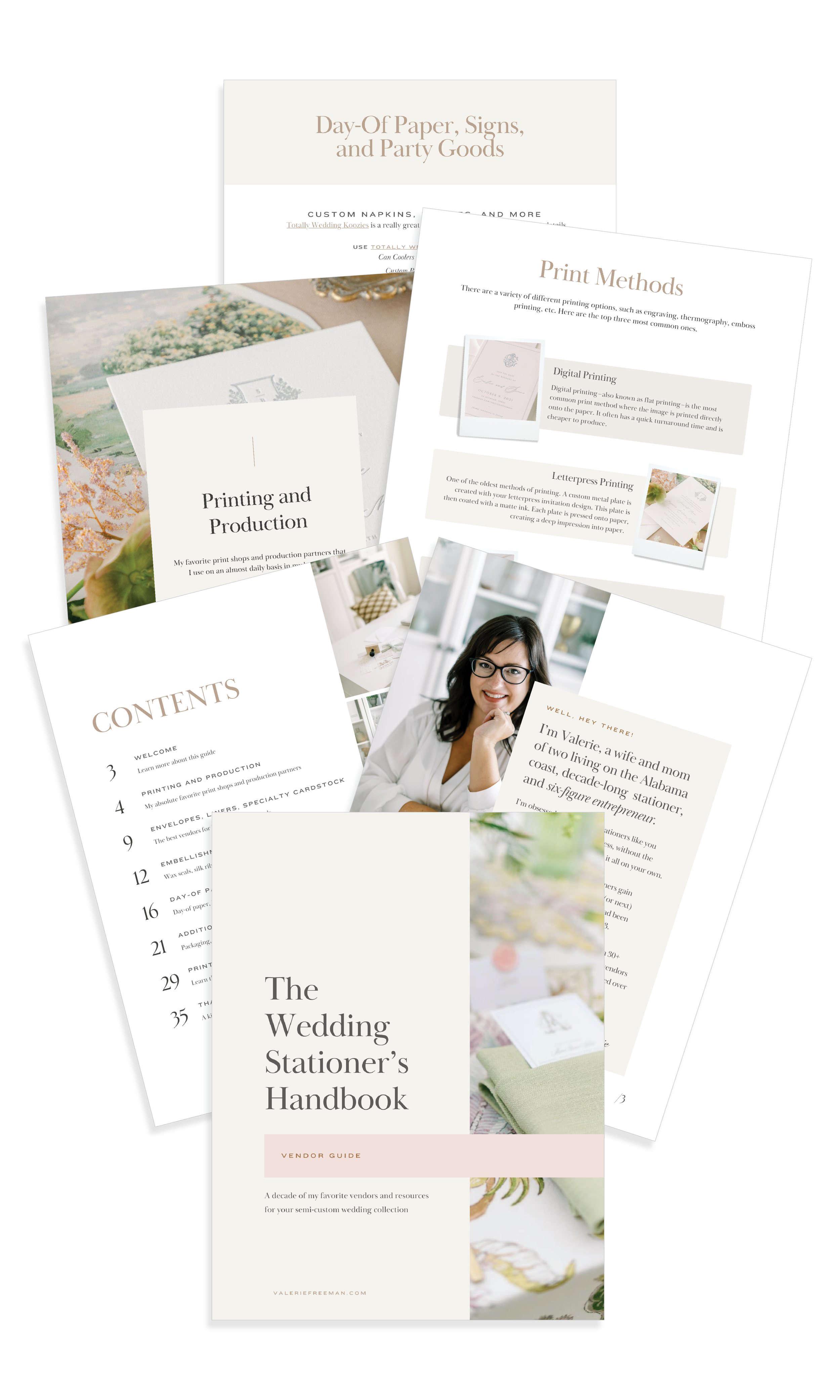 The Wedding Stationer’s Handbook is a 30+ page PDF that gives you direct access to vendors and resources that I’ve relied on and trusted over the past decade of being in business.